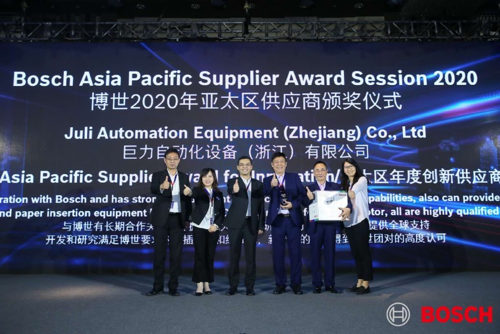 在《博世2020亞太區(qū)供應商頒獎儀式》上,巨力自動化公司獨占鰲頭,從多供應商中脫穎而出,獲得了此次博世集團頒布的亞太區(qū)供應商《亞太區(qū)年度創(chuàng)新供應商》獎項。